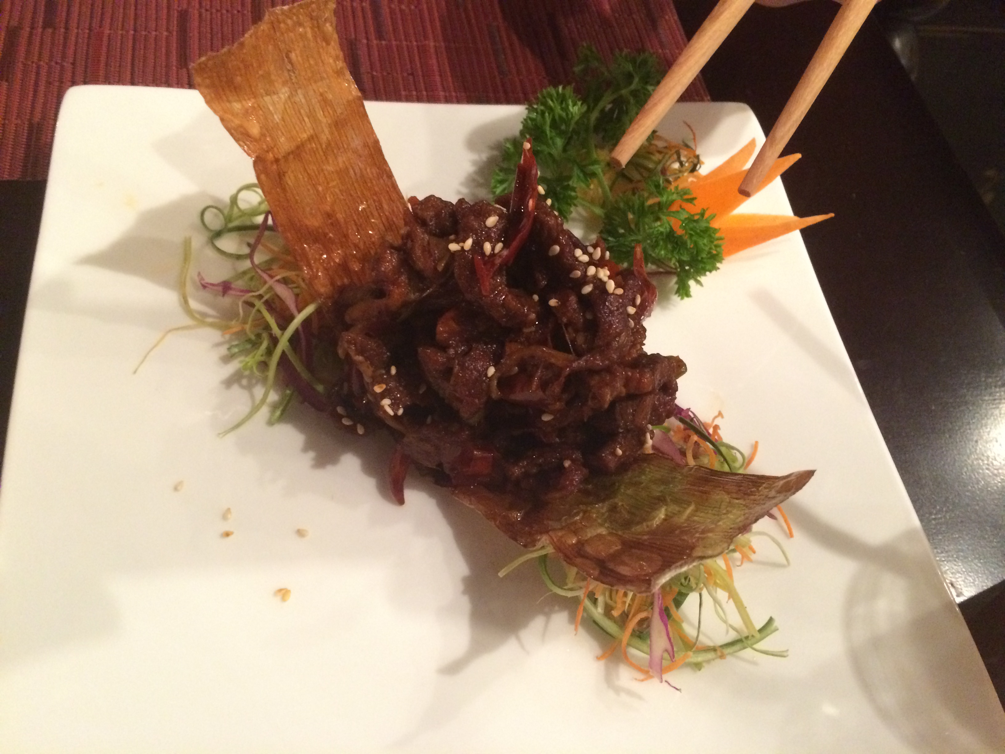 For starters we ordered steamed prawn dim sum and crispy Szechuan beef with chilli. The four dim sum were delicious, packed with filling and served with dipping sauces, the beef was served warm as requested and consisted of small fried strips of beef with a fiery chilli sauce – be warned its pretty hot!