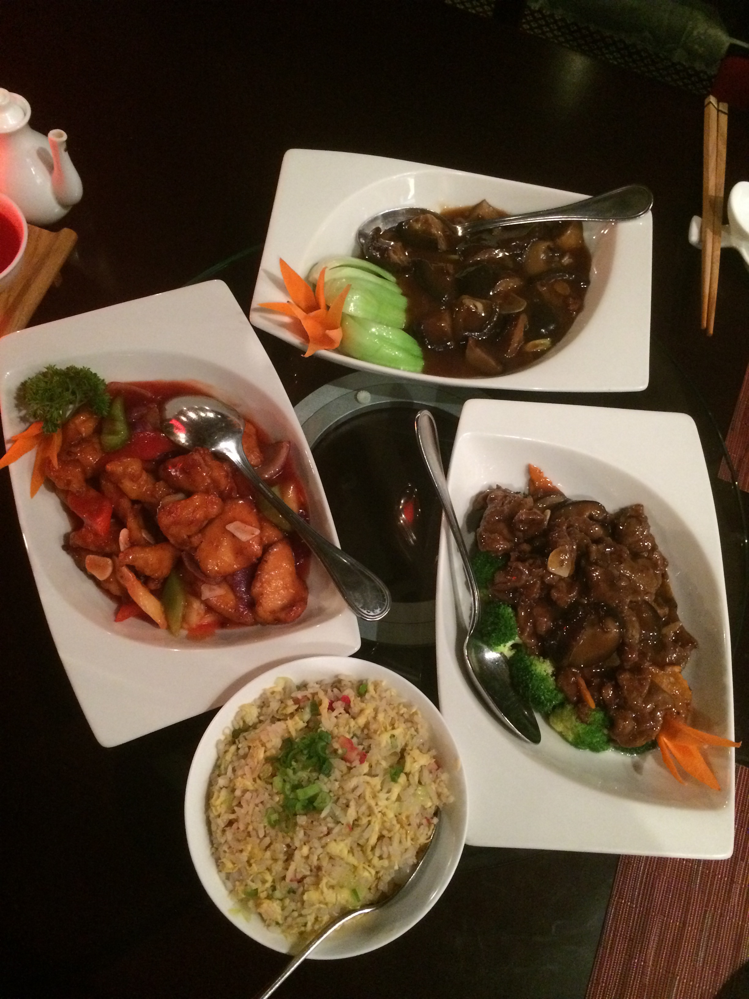 For mains we ordered sweet and sour chicken, beef in oyster sauce, fried rice with duck and prawns and pak choi with mushrooms. The chicken was really fruity and tasty, big chunks of chicken, fruit and veg in a sauce that wasn’t too gloopy or sugary. The beef with broccoli was quite salty due to the oyster sauce with big pieces of beef and tender broccoli which had kept its crunch. The rice was very good as was the pak choi and mushrooms.
