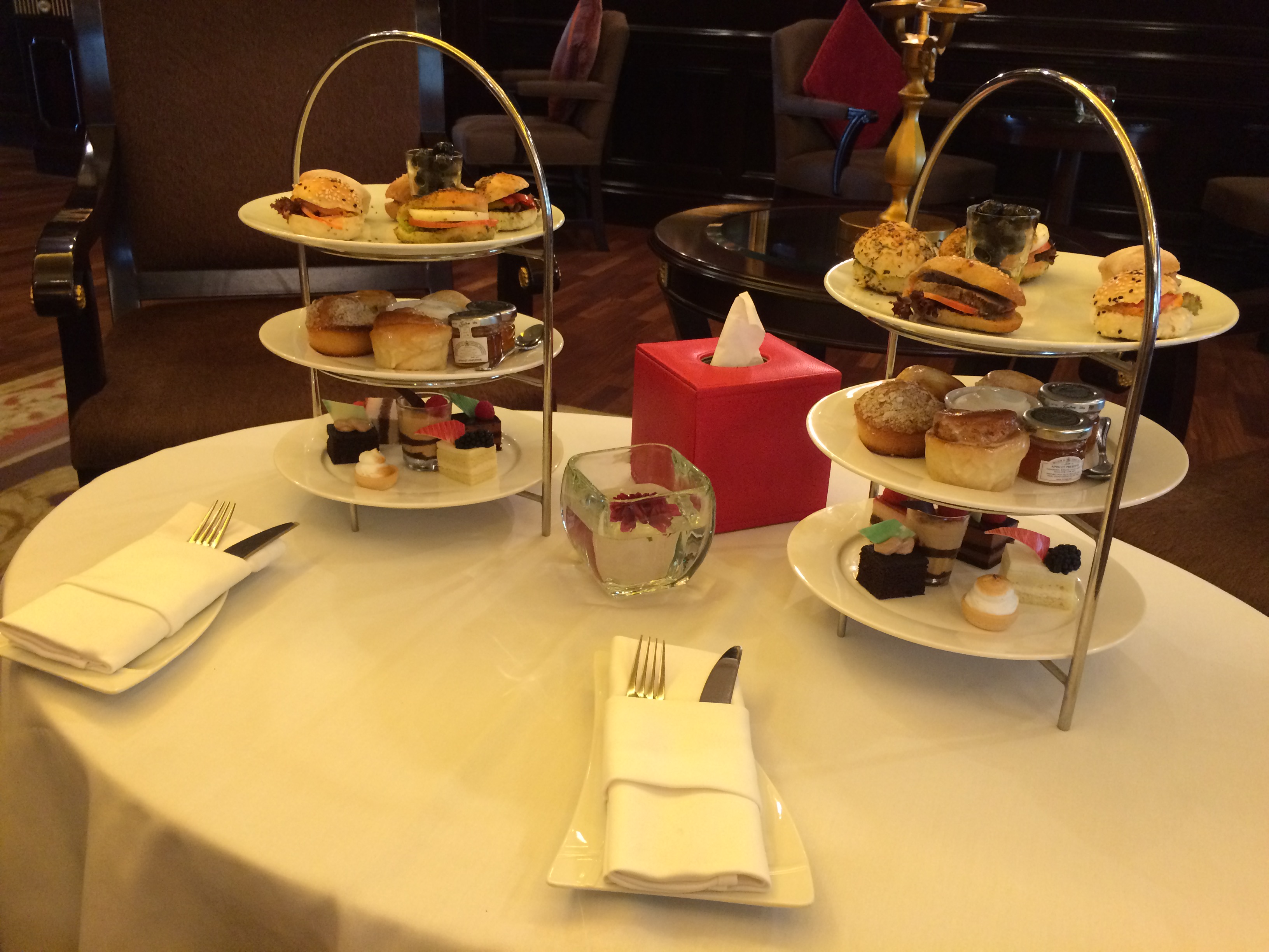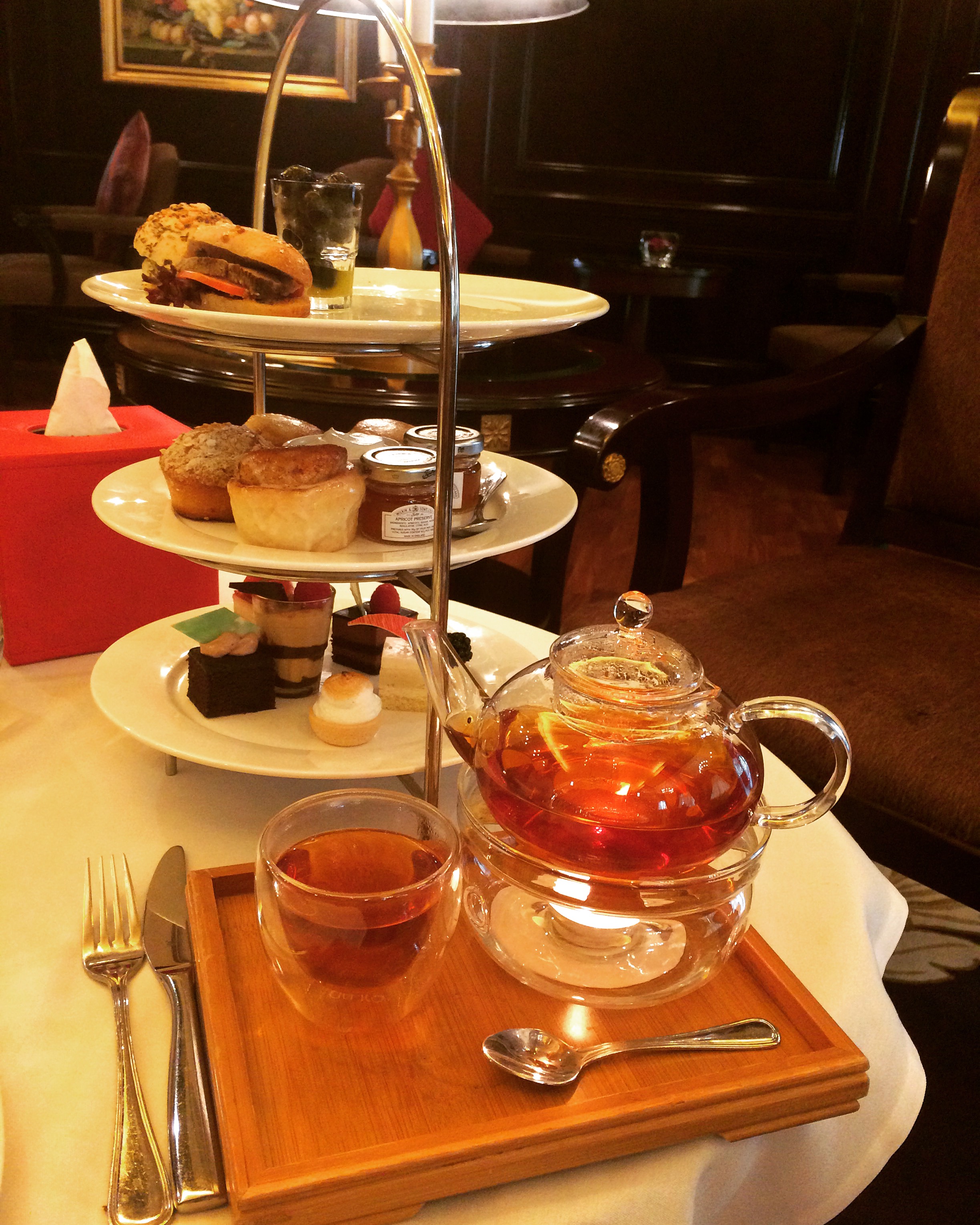 We were given a large selection of tea to choose from with suggested brewing time and temperatures, I decided on good old fashioned Big Ben -English breakfast and Rachel went with Chamomile. I thought the choice of tea pot and cup was a bit out of place as they were both clear and very modern which didn’t seem to fit in with the design of the afternoon tea other items or the surroundings! After placing the tea order our 3 tiered savory and sweet snacks arrived. It would have been nice at this point to have explained what each item was but they were just placed in front of us so it was a bit of a guessing game. The sandwiches were very fresh and all on different types of bread,  fillings consisted of salmon, roast beef, smoked chicken, roasted vegetable and my favorite – mozzarella and tomato with pesto. At this point we both decided we needed another pot of tea so we ordered the same again as we thought it was unlimited and as the tea is freshly brewed you can’t just ask for hot water!