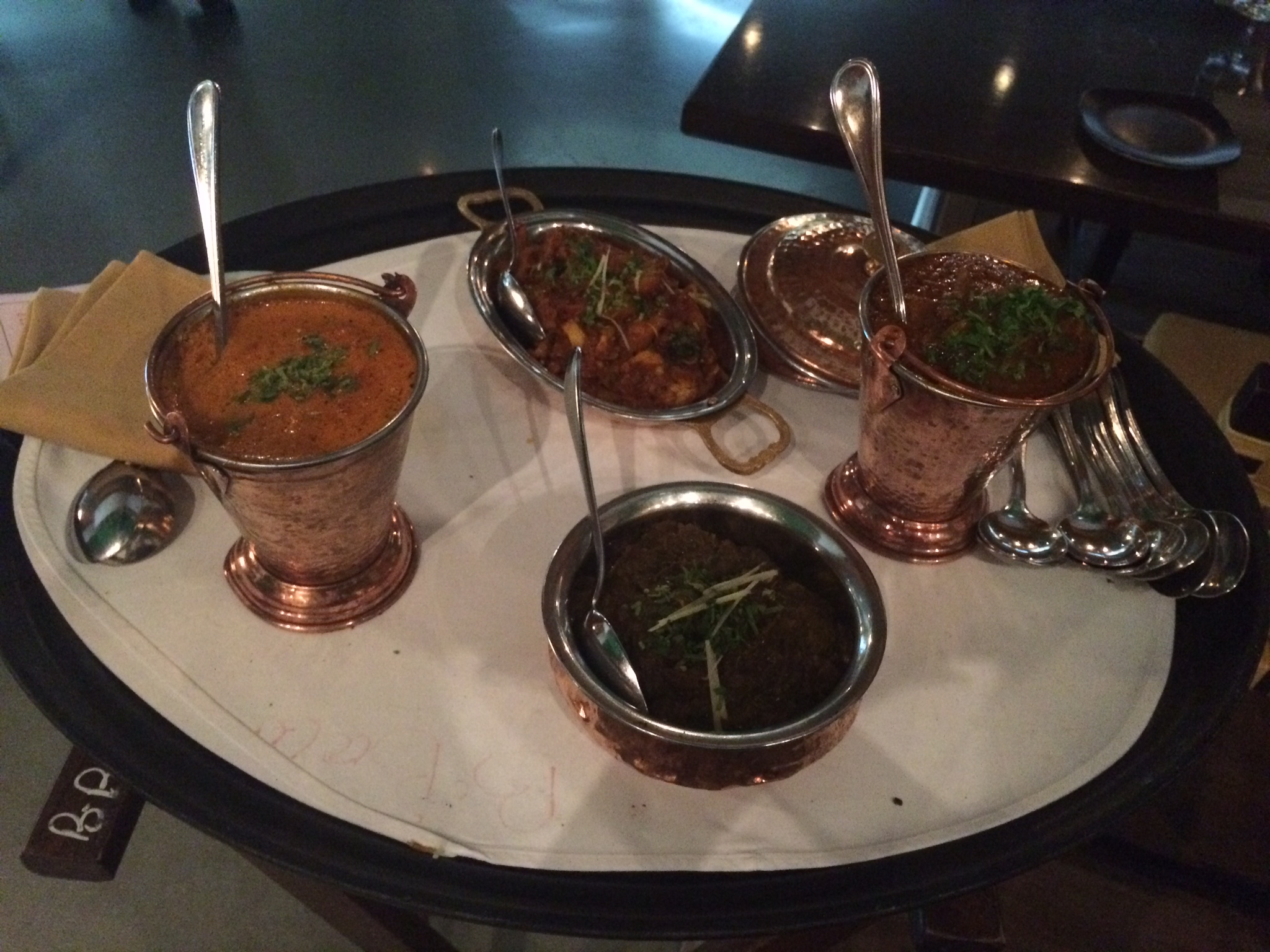 We were were seated quickly and Malika our server brought menus. I am well aware that many Indian restaurants do cater for Western tastes and the menu here was no different consisting of samosas, kebabs, pakoras, meat and fish dishes, a vegetable section and rices. We ordered Chicken Tikka, Lamb Rogan Josh, Hammour Saagwallah, Saag Aloo and steamed rice. While we waited for our dishes to be brought we were given very moorish popadoms with a variety of sauces. Our mains arrived quite quickly and were well presented in copper tubs and lovely warm plates. The meat in all the dishes was very tender and plentiful, there was defintely a blend of different spices defining each dish rather than having everything taste the same which does sometimes happen with Indian dishes. My favourite was the Chicken Tikka along with the Saag Aloo as I found the mustard in the Hammour Saagwallah a little too strong for my taste.