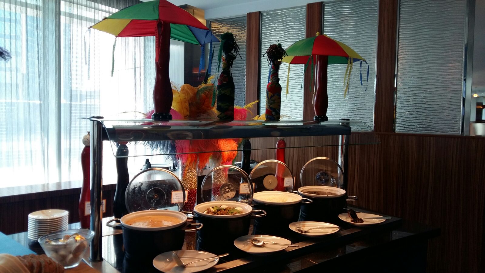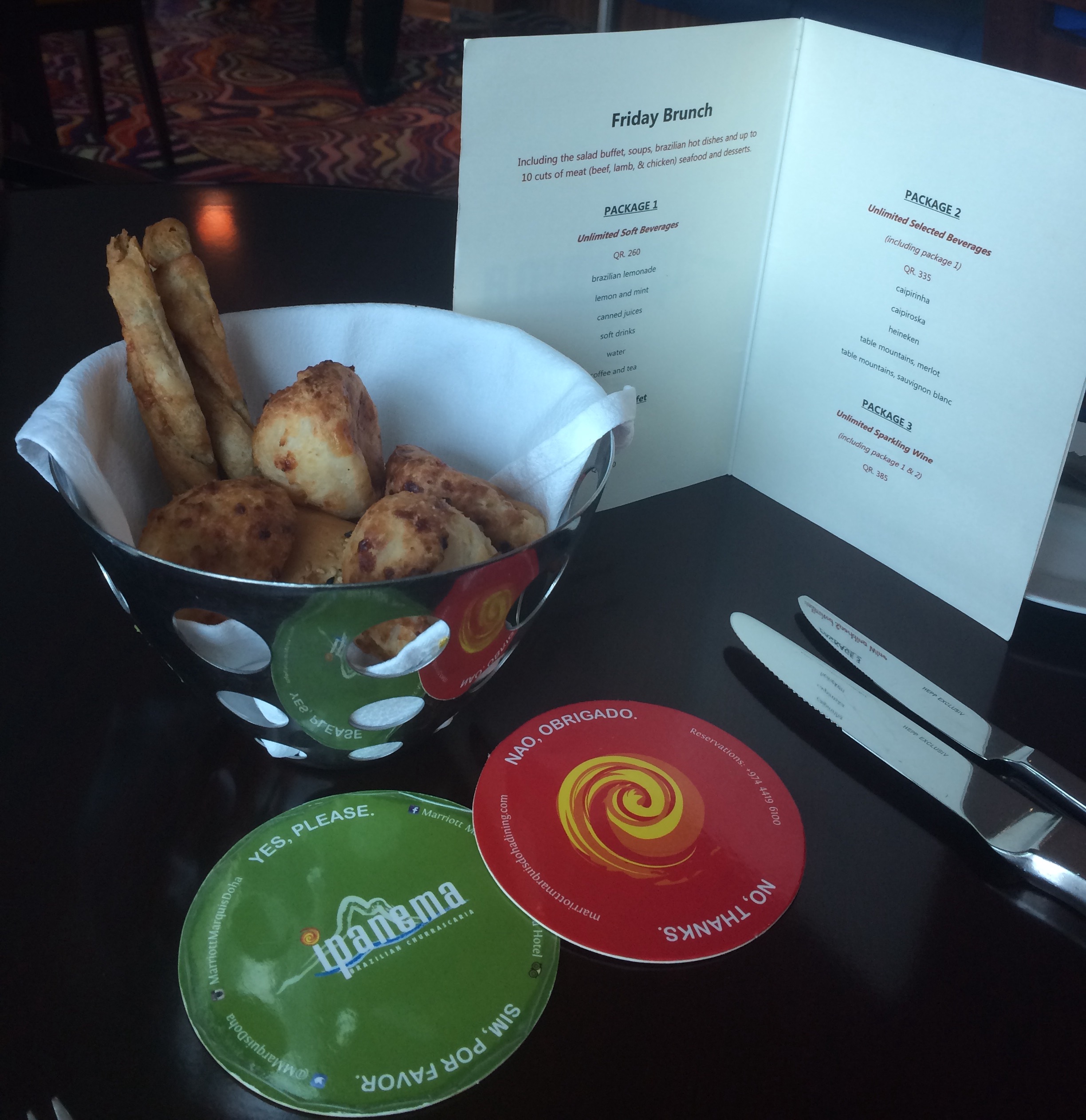 ‘ Brunch is a marathon not a sprint’ was the pep talk I overheard from one of the tables at the Ipanema brunch on Friday, I wish I taken this advice. I had read good reviews of this Brazilian Churrascaria styled restaurant and we were keen to try it especially as we can see the restaurant from lounge and involves very little effort getting there ( our car had broken down that morning). The atmosphere when we walked in set the scene nicely – a lively bar area, carnival head dresses on display and a samba band. We received a warm welcome and the concept of the Rodizio service was explained to us as were the different price options available.