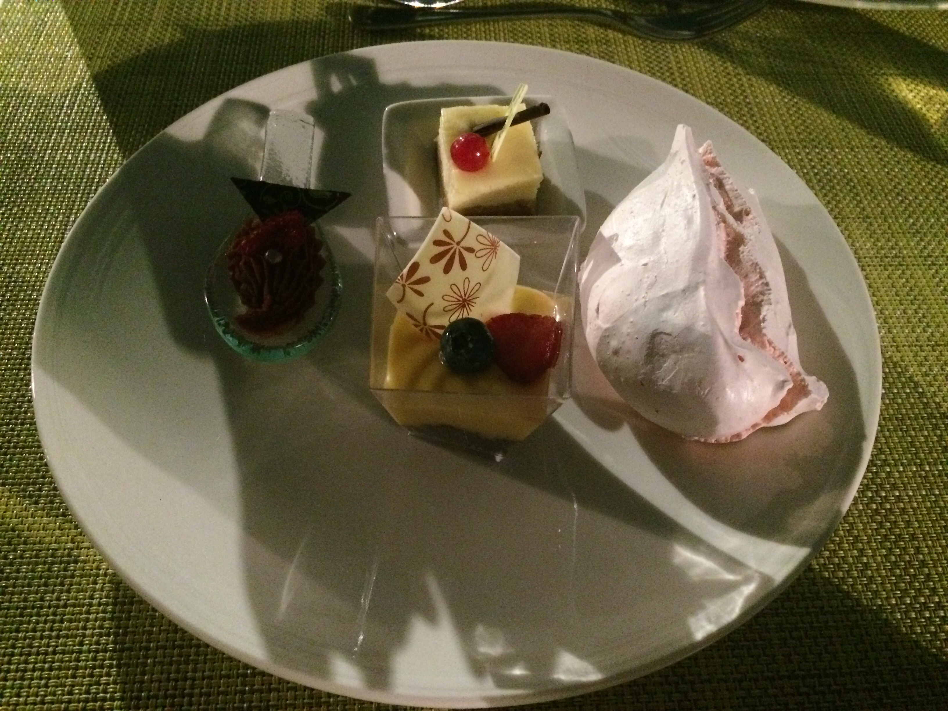 Chocolate mousse, cheesecake chocolate with mango and meringue