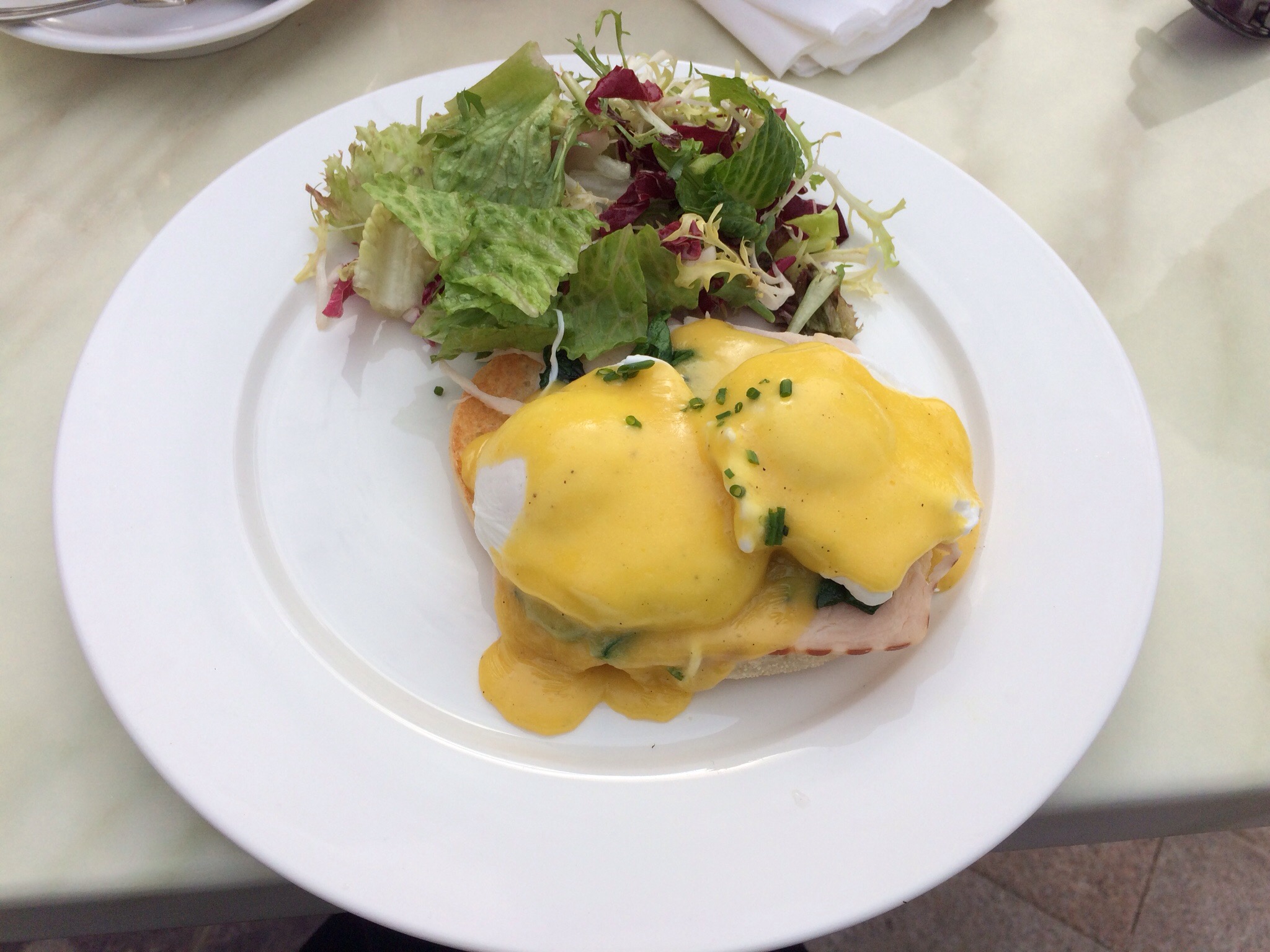 As soon as we sat down a waiter came out, welcomed us and we perused the menu. Fresh juices and coffee arrived quickly and we ordered breakfast. The food arrived within ten minutes, fresh, hot and really tasty. Three orders of Eggs Benedict one with salmon, one with ham, one with bacon and all with runny yolk eggs as requested, toasted muffin, salad and a good dollop of rich hollandaise sauce (although this could have done with a splash more vinegar and lemon to make it shaper).
