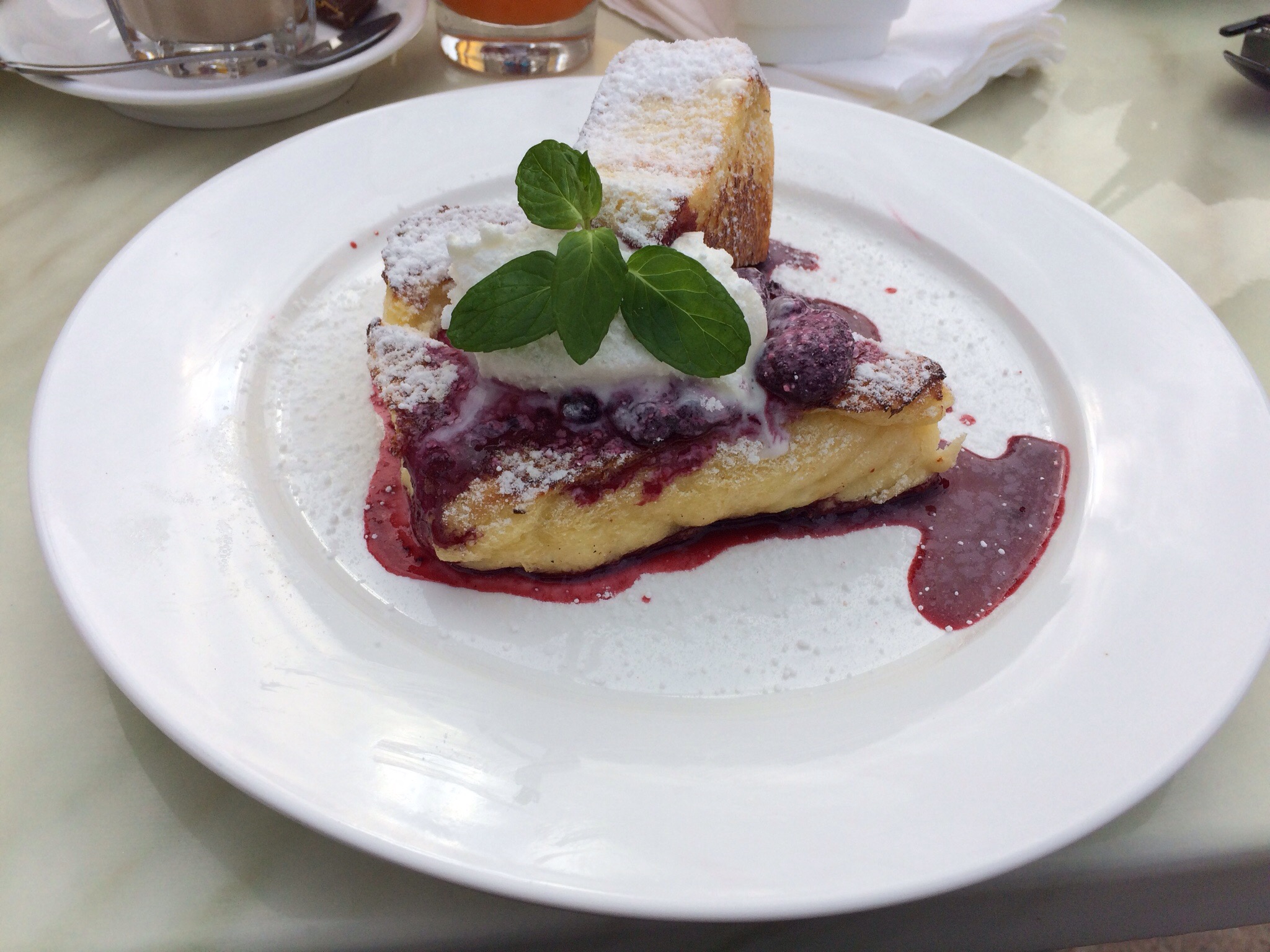 I ordered french toast with berries and mascarpone and it was perfect. The toast was crunchy on the outside and soft in the middle, the mascarpone was thick and rich and the berries were sweet without being tart. There was a good balance of each component part.