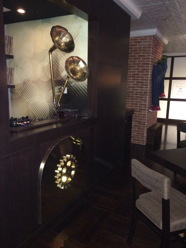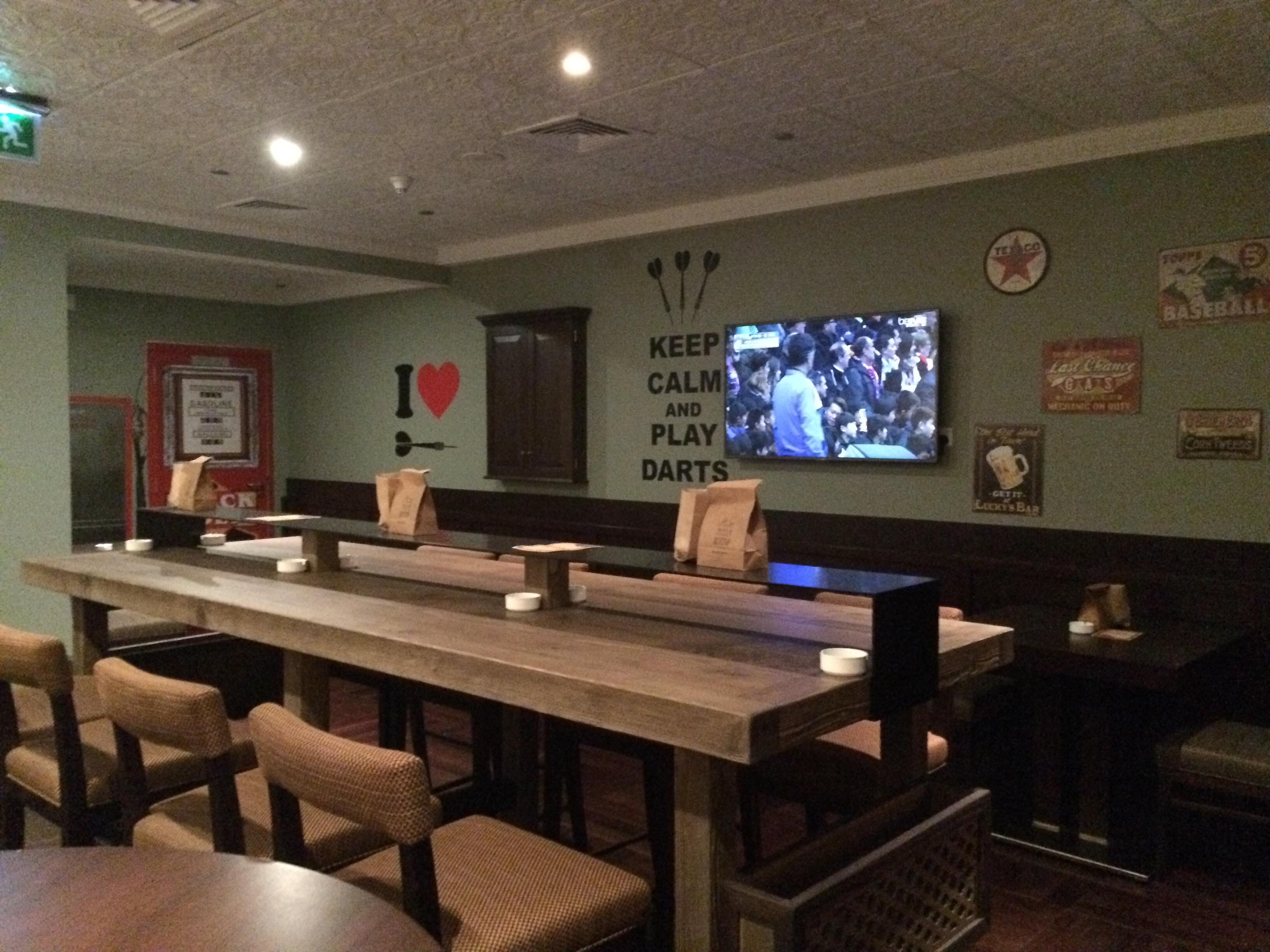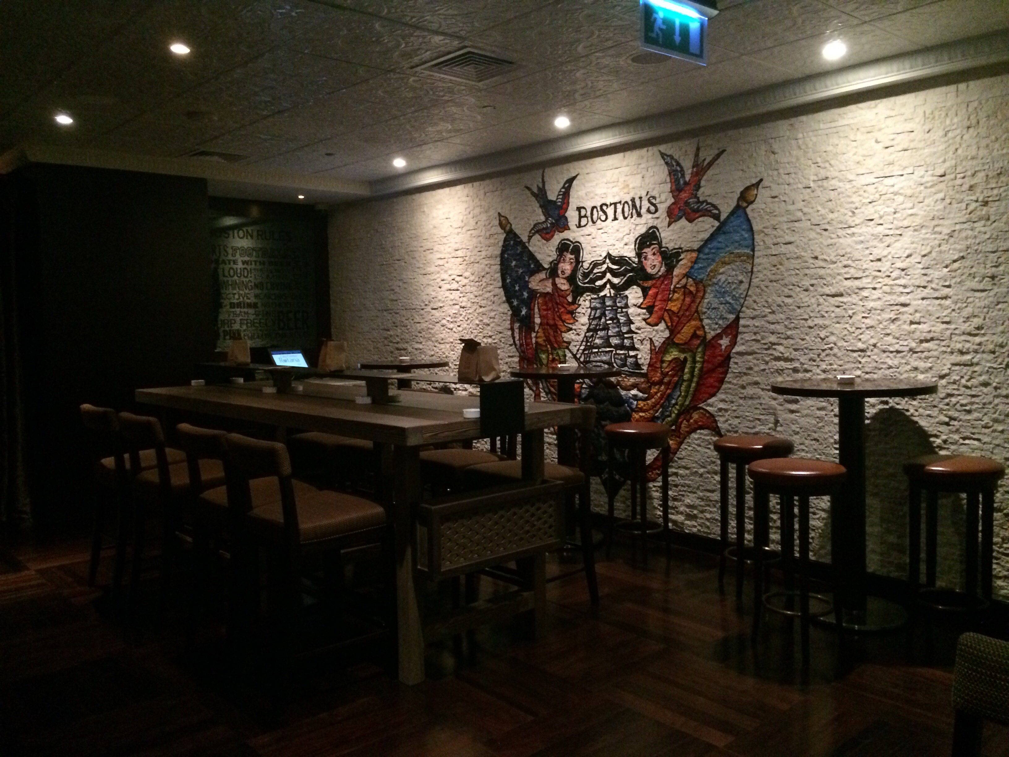 On Saturday I was invited to a preview evening at Boston’s Bar at the new City Centre Rotana Hotel. Its quite hard to describe the design of the bar, its a quirky fusion of sports bar / diner with music, decorated brick walls, art installations, booths and a large bar with stools in keeping with the ‘Cheers’theme and more contemporary tables and chairs. As the bar filled up the atmosphere was buzzing and I can imagine it will be a fun place to go to for an informal meal with drinks.