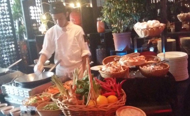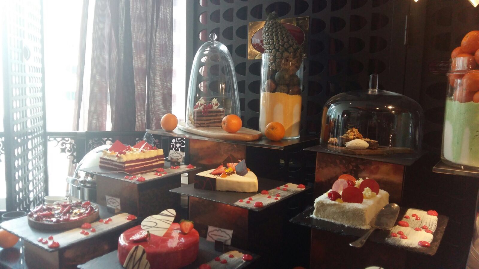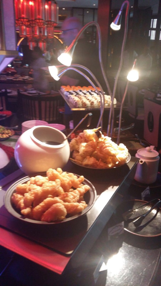 We arrived just after 12pm and as usual received a professional welcome and were swiftly seated. I’d specifically asked for a table by the window as it’s more light and airy plus the live band and food stations are located in the lower section and it can get quite loud and busy. We actually opted for a non alcoholic package ( we’d had a few cocktails in Spice Market the night before!) and just wanted to enjoy the food. As expected the majority of the food is of Asian origin. We started with some of the best sushi and sashimi, delicious plump king prawns, tempura fish and vegetables. The California rolls were a winner.