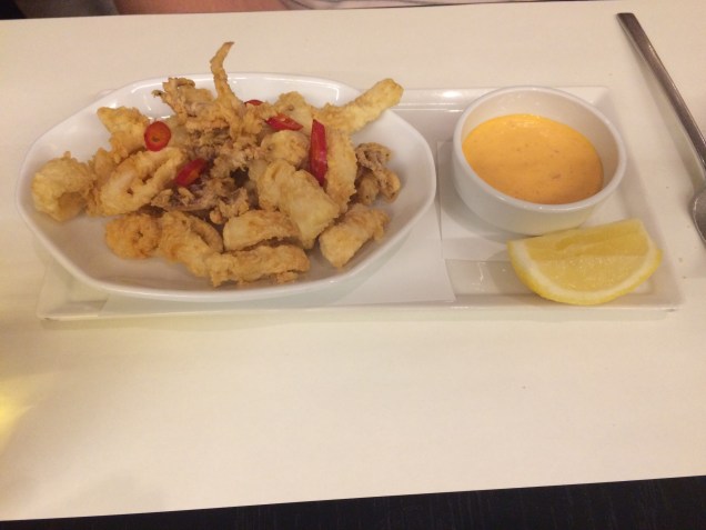 My tomato and mozzarella salad with basil and balsamic was a good size, the mozzarella was thick and creamy and it was well seasoned. I did find a couple of the tomatoes slightly under ripe, they were a bit hard. Greg ordered the calamari with lemon harissa dip and it was delicious. The calamari was crispy, not too oily and the dip had a lovely kick to it.