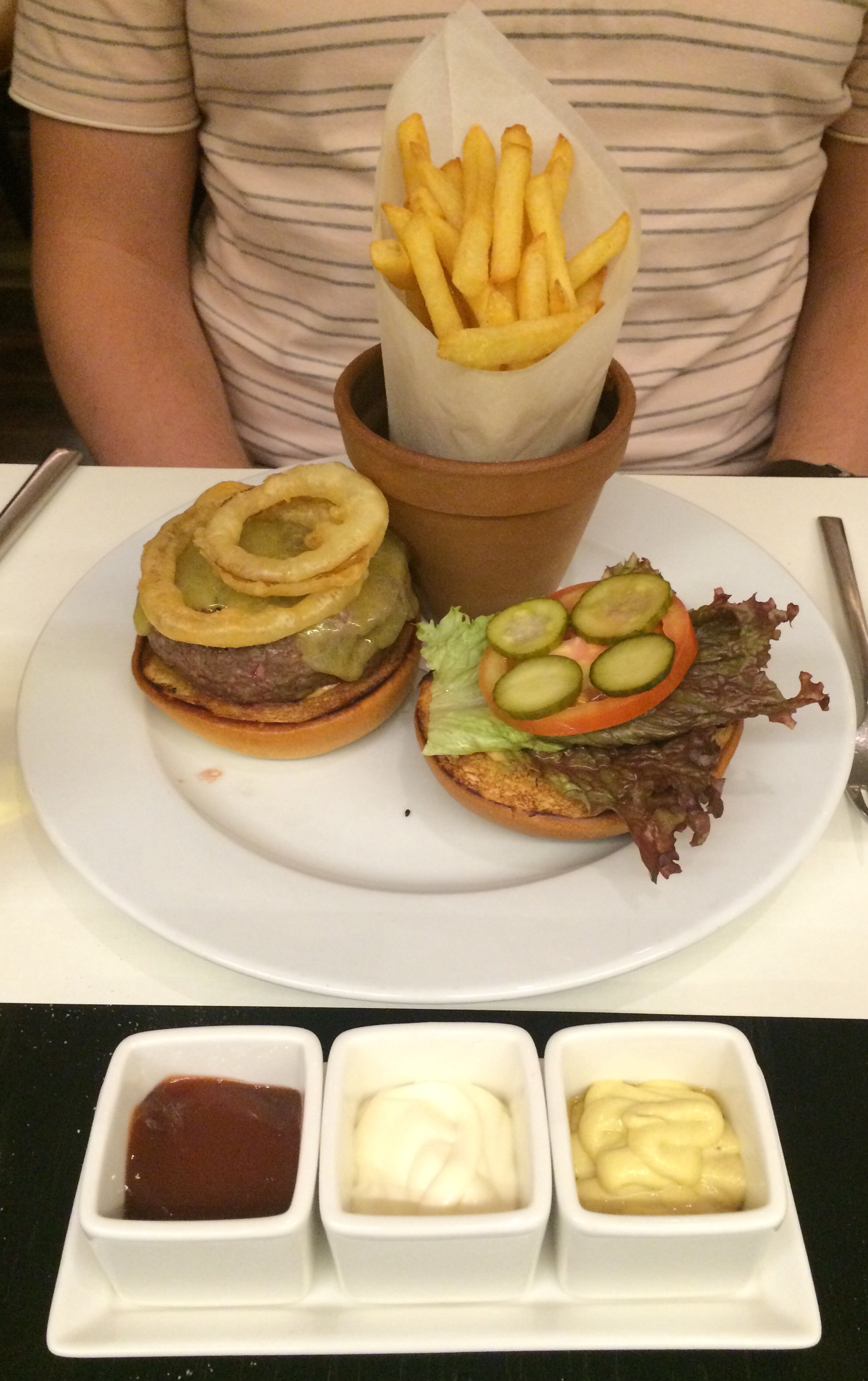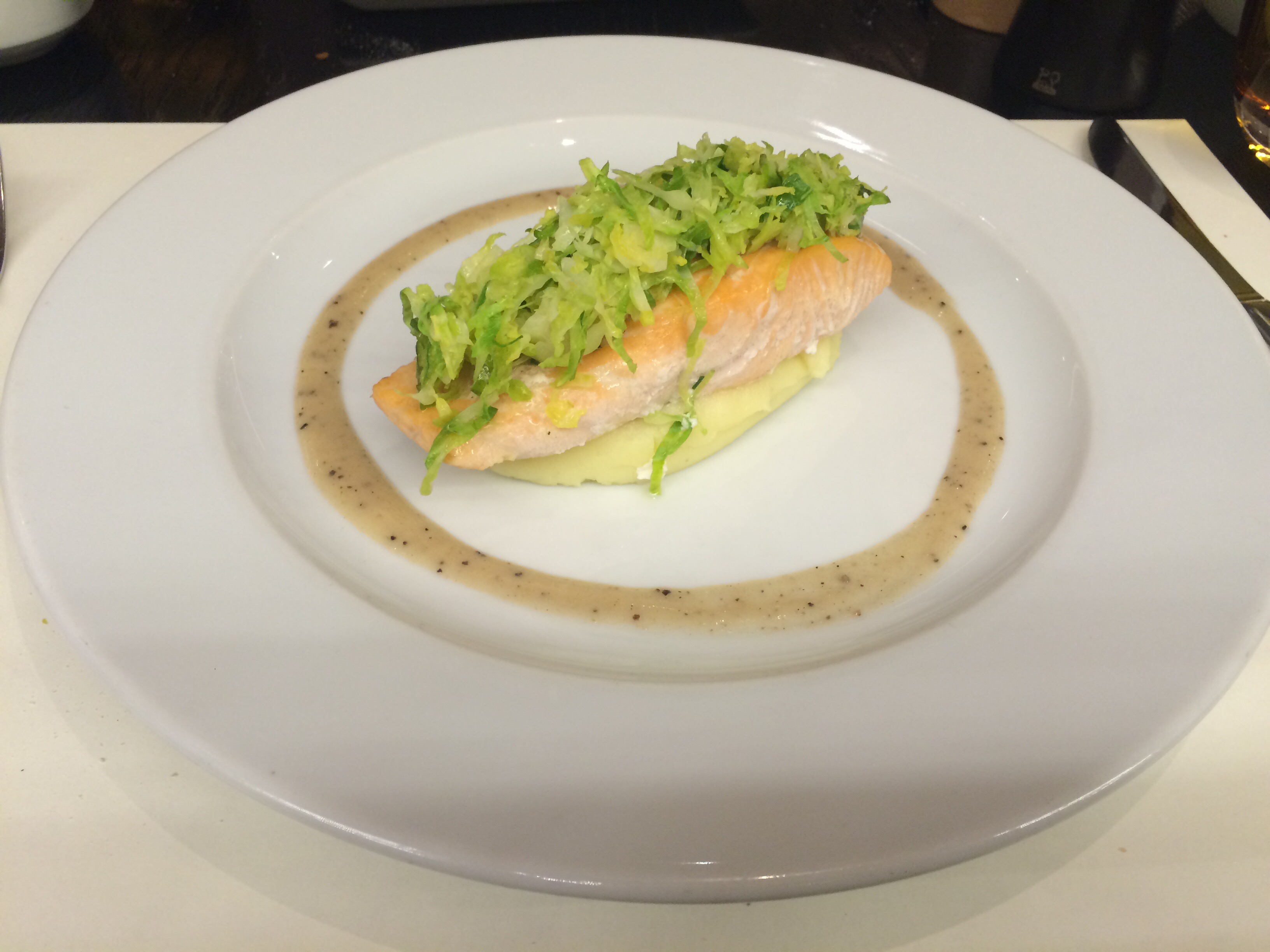 As this is an express lunch service was swift, our plates were quickly tidied away in preparation for our mains arriving. Whilst we were waiting the server came and explained the new ‘ Supper Club’ menu being offered every day ( except Friday) 3 courses for 100QR 5pm – 7pm and the ‘ Gin o Clock’ offering unlimited Gin Sunday – Thursday 5pm – 7pm for 120QR. These promotions sounds great and I am sure we will be back to try it out! Soon our mains courses arrived. My salmon with mash was light, fresh and cooked perfectly and the mash was creamy and not too heavy, the shredded sprouts gave texture. Greg’s cheeseburger was huge…… really huge. It was the kind of burger you need to cut in half before you tuck in! He had asked for it medium rare but the middle was a little too rare for him so he left a little bit but other than that it was delicious.