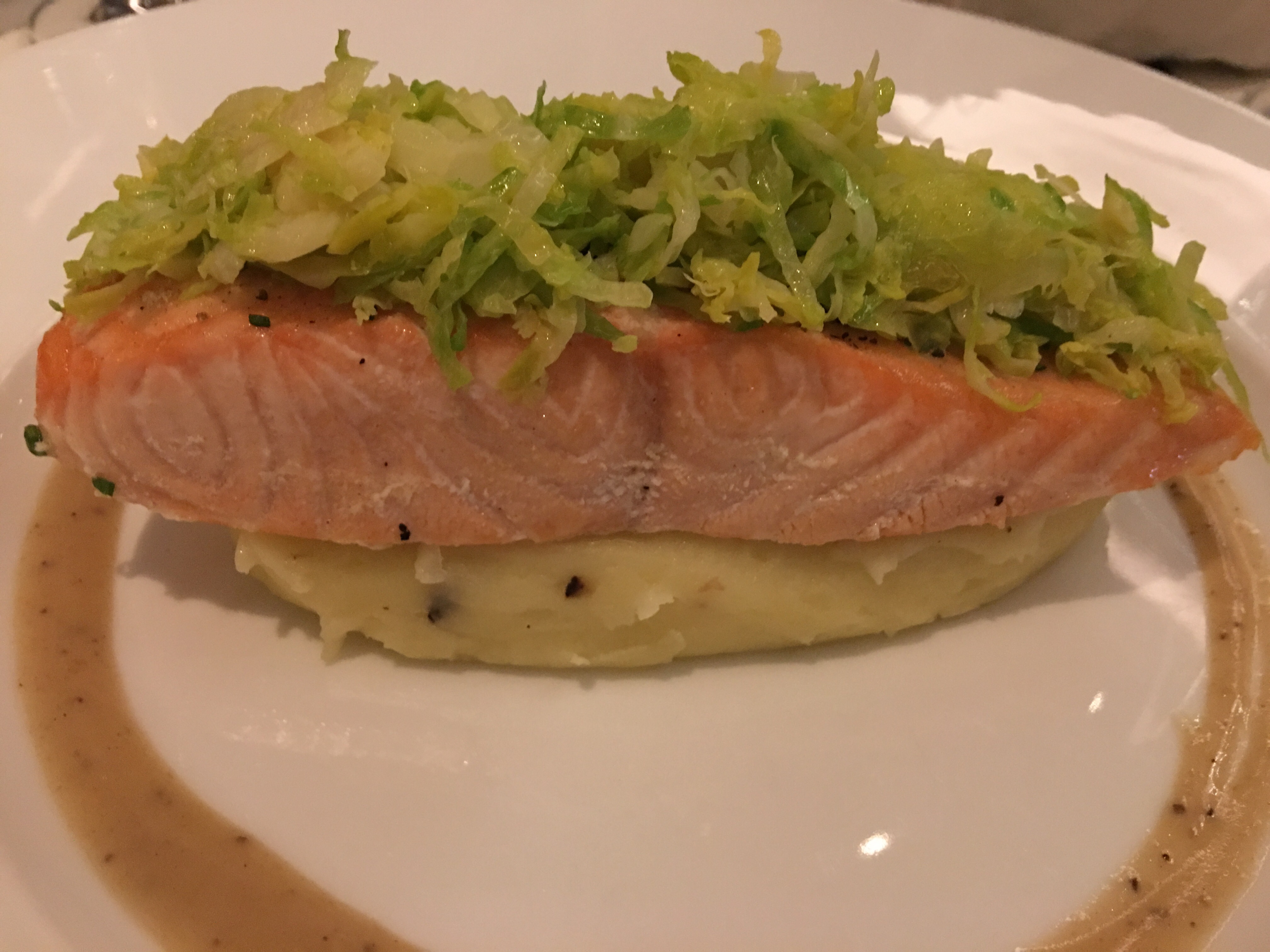 For starters 3 of us opted for crispy shrimps with a honey and mustard sauce and one person chose the tomato soup. When our starters arrived I was surprised at the portion size, lots of evenly cooked, crispy shrimp with a smokey, sweet sauce which had a bit of a kick to it and some soft creamy avocado as a contrast.The tomato soup was nicely presented with sourdough and cheese in the bowl and the rich, thick soup poured at the table. For our main course we ordered one fusilli with mushrooms, one parmesan crusted chicken and two salmon with potato purée . All of the mains were well cooked and were presented with care, again all were large portions. The salmon which I ordered medium was cooked to perfection and the purée was smooth and creamy. The shredded sprouts added a bit of crunch and the black truffle emulsion brought everything together. Everyone’s clean plates spoke volumes!