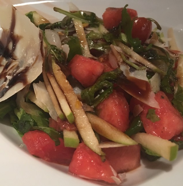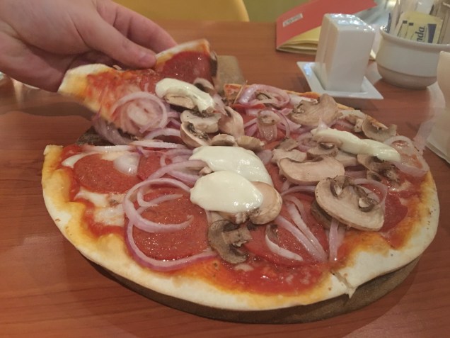 As we enjoyed this food so much we chose to go there on Friday but this time we ate in rather than taking our food away. Greg was delighted to see a Cornish pasty on the menu but he couldn’t decide between that and a pizza so he ordered both! I liked the look of the fresh salads of which there are some wonderful combinations of ingredients. I chose an apple, watermelon and rocket salad with balsamic dressing and Parmesan. Once again our food arrived quickly and it was hot and fresh. I did think there was a little too much balsamic on my salad but luckily this didn’t overpower the delicious flavours. The Cornish pasty was excellent – flaky, buttery pastry with a well seasoned filling. The pizza was light and crispy.
