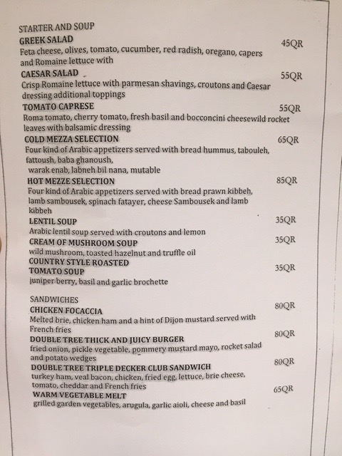 Lunch is 60QR for 2 courses and 90QR for the full buffet. This price includes water and tea / coffee. The full a la carte menu is also available.