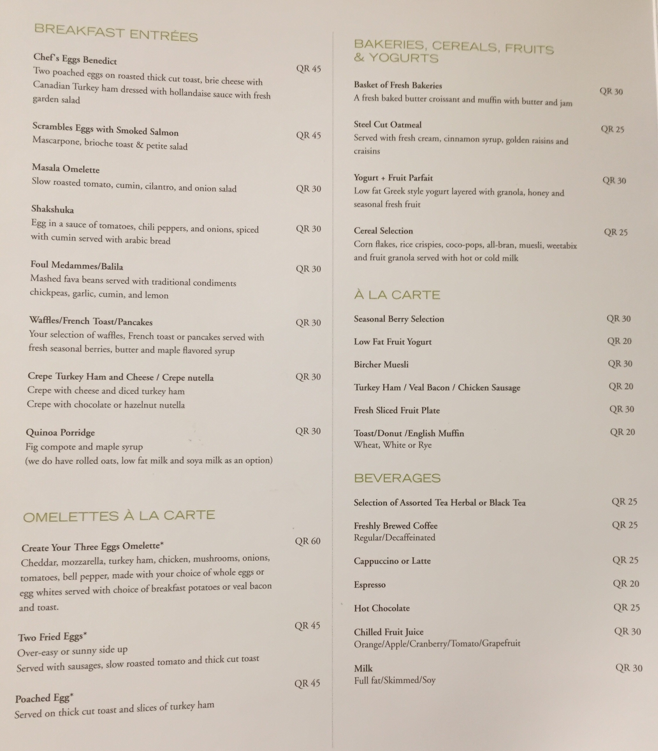 Breakfast is 110QR (8-10am is 70QR) a full a la carte menu also avilable.
