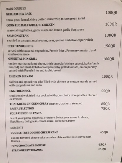 Dinner is 85QR and served from 6pm (65QR if you at between 6pm – 7pm) and includes water. The full a la carte menu is also available.