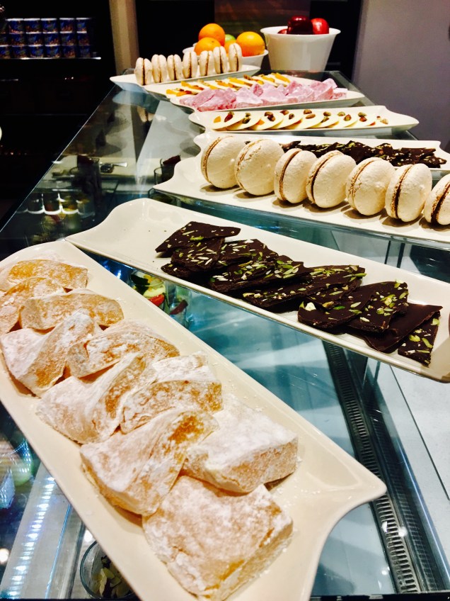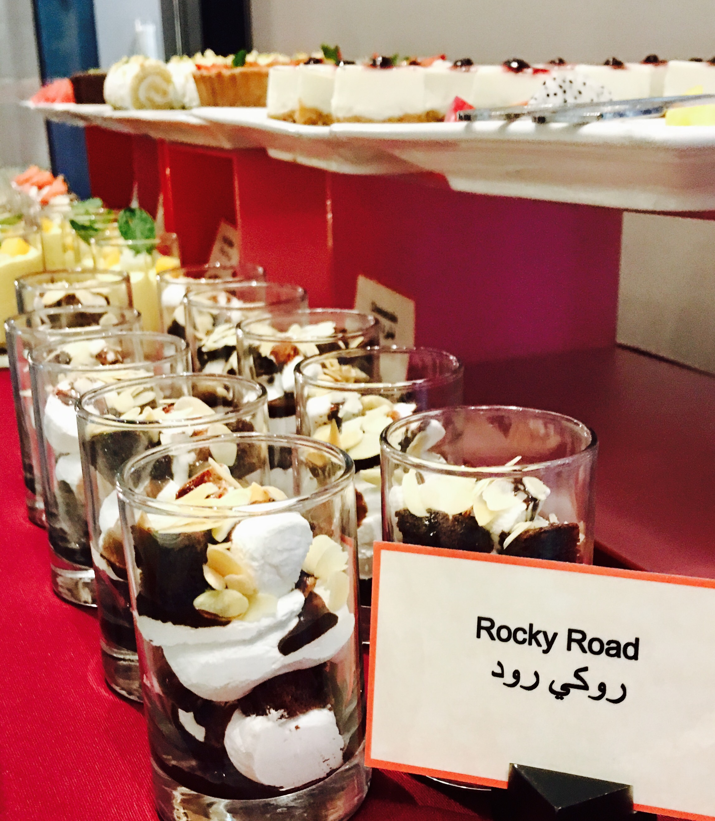 Dessert was next and whilst it the choice was as extensive as at some brunches there would be something to appeal to most people. From traditional Arabic Umm Ali and ‘oriental desserts’, individual rocky roads, mahalabiya, cheesecake, fruit tart, chocolate brownies plus platters of chocolates, turkish delight and macarons.