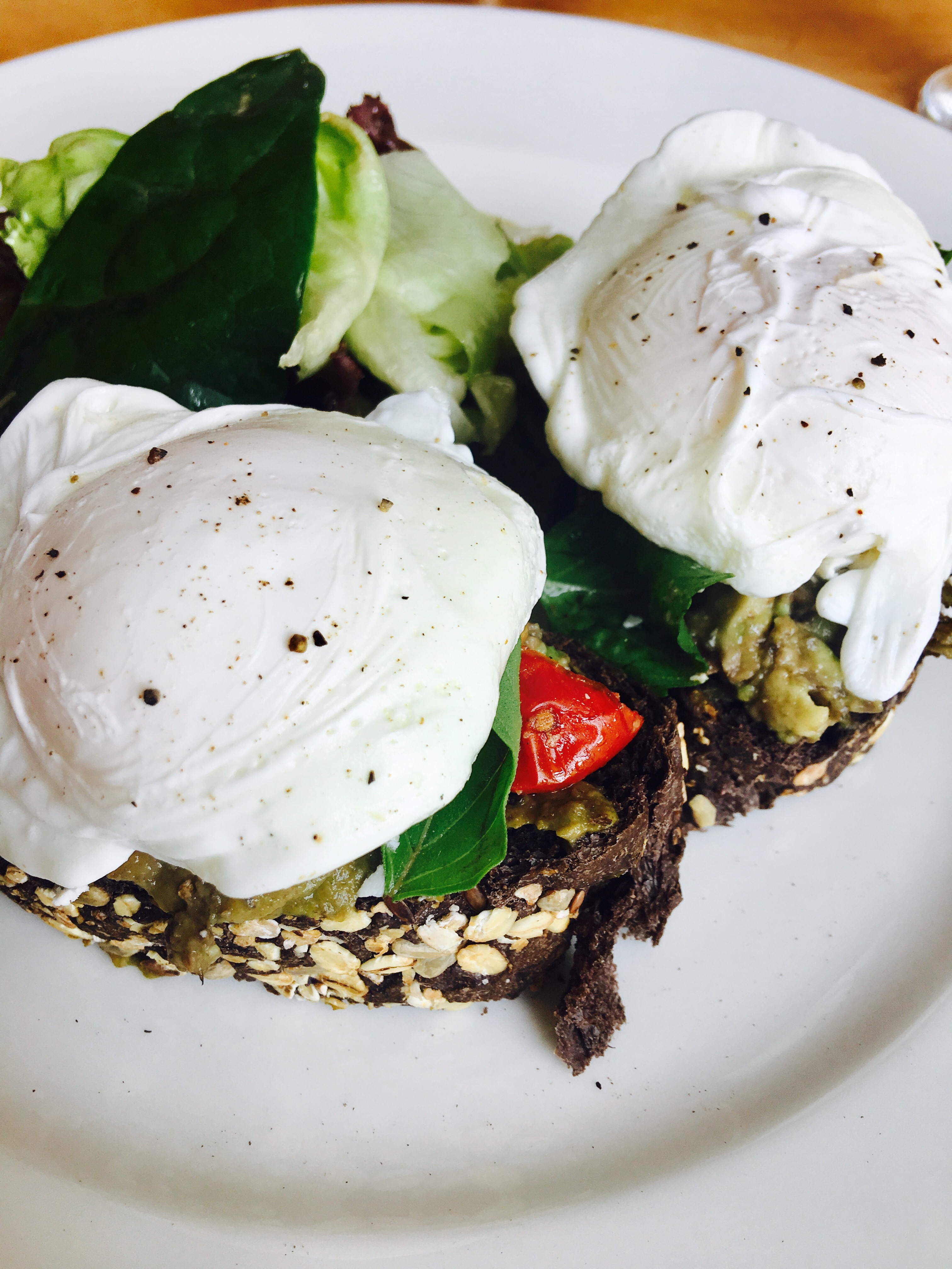 Poached eggs with avocado on pumpernickel (44LE)