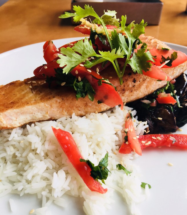 Salmon with basmati rice and aubergine (185LE)