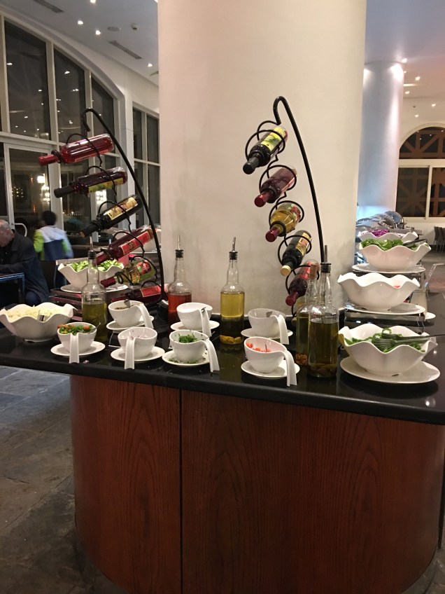 We arrived after a pretty daunting journey (I’m sure we weren’t traveling on an official road for some it) at about 8pm and, after checking in, arrived at our room – except it wasn’t the room we booked. It didn’t have a sofa, bath or a double bed so after a quick call to reception, apparently they thought we’d like this room better, we were told we could move rooms after dinner. Not quite the relaxing start we’d hoped for. We booked our room on a half board basis so our rate included breakfast and dinner* with both served in the Cataplana restaurant. This is the hotels main restaurant and has several ‘overspill rooms’ a conservatory, terrace plus the primary dining area. Throughout our stay the restaurant was extremely busy, the staff were efficient at clearing spaces and replenishing cutlery but it was a bit of a scrum at times especially at breakfast. However, this was understandable due to the adverse weather which meant the outdoor terrace couldn’t be used.