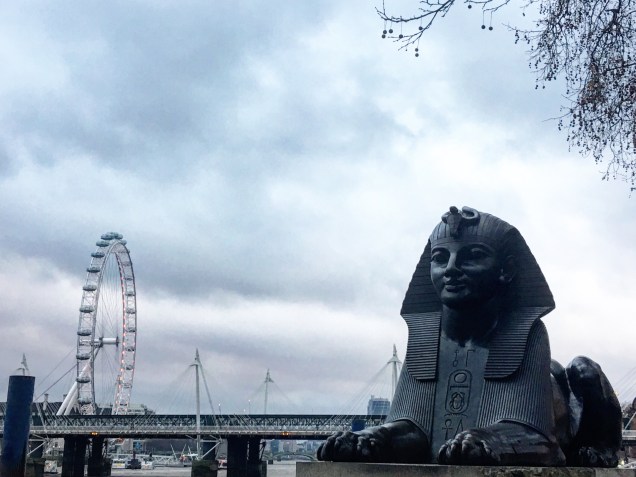 E is for Egypt in London. Along the banks of the Thames we saw the Cleopatra’s Needle and statues of the Sphinx which bare the scars from being hit by shrapnel in WWII.
