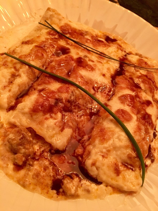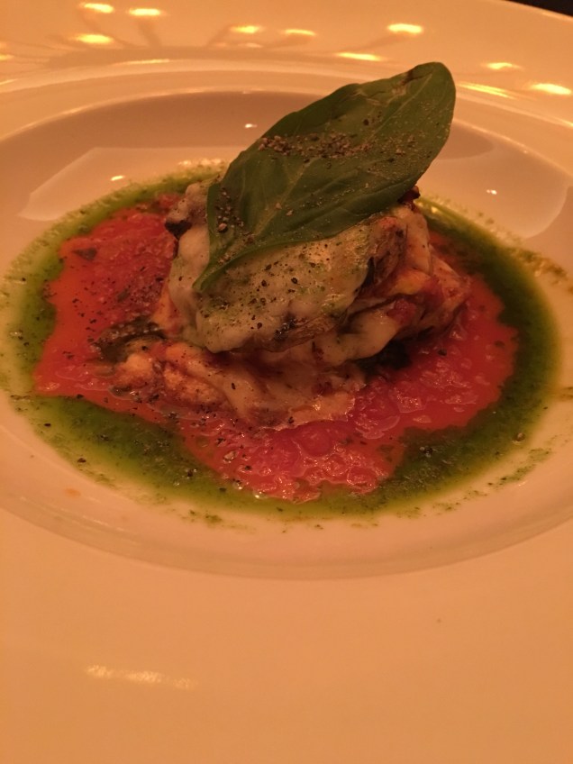 The eggplant parmigiana was fabulous. A tasty balance of soft eggplant, a well seasoned tomato sauce and good quality buffalo mozzarella drizzled with fresh basil oil. It was really nicely presented too and a perfect sized portion. I think they felt sorry for me because I didn’t have a starter and I was brought an amuse bouche of cherry tomato, basil and the creamiest, softest mozzarella pearl –  simple yet so tasty. After a suitable gap our main courses were brought over.
