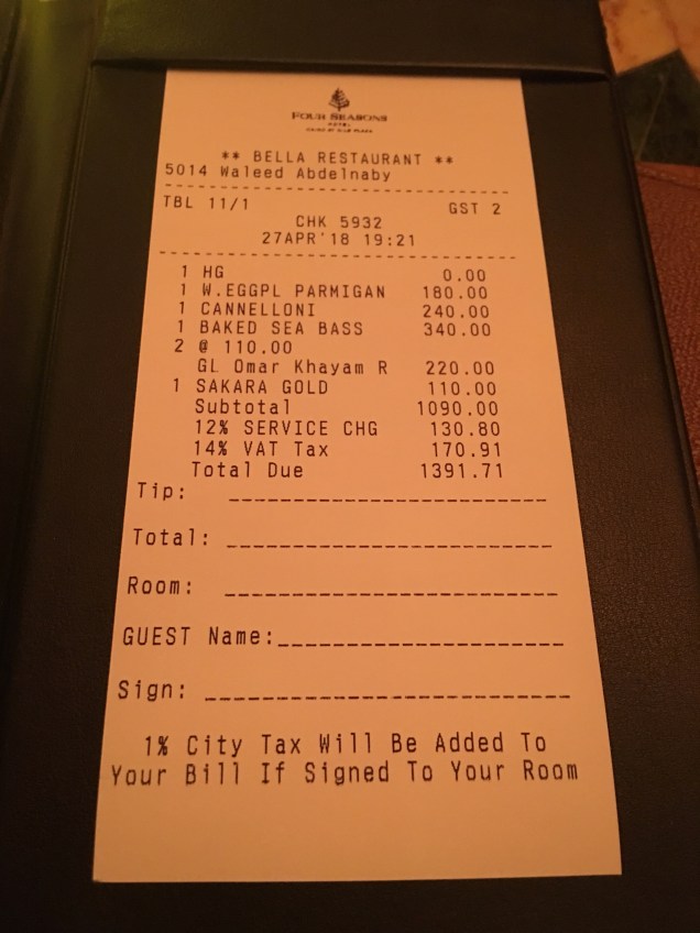 As you can see from the bill the cost of our meal including taxes and service came to just under 1400LE. Bella isn’t a cheap place to eat but it’s one of the nicest meals we’ve had since we arrived in Cairo and, for me, the cannelloni (bold statement warning) is one of the best Italian dishes I’ve ever had. The service throughout was the perfect balance of friendly, professional and discreet. My plan to skip the starter and have dessert was pointless, the cannelloni was so filling I didn’t have room for dessert –  a good excuse for a return visit!