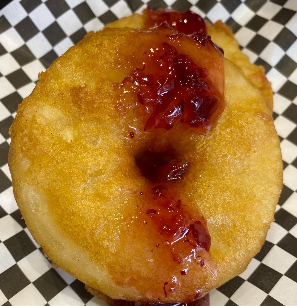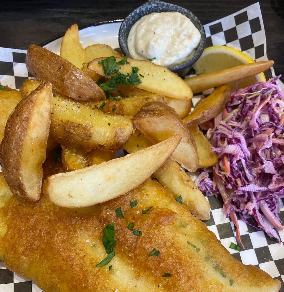 We ordered 1 portion of fish & chips, 1 serving of onion rings, 2 cheese balls and 2 pineapple fritters – do not come here and expect it to be a healthy option! Everything is cooked fresh to order and our food arrived quickly. The fish had a thin, light, crisp batter and the wedges ( you can choose wedges or chips) were good too. The coleslaw and tartare sauce on the side offered a bit of crunch and acidity. The onion rings served with a sweet chili mayo were so good I wished we’d got a portion each, I’d definitely order those again. The pineapple fritters served with a berry jam reminded me of going to the chippy or Chinese takeaway in England and getting battered pineapple rings / banana – so bad yet so good!!!