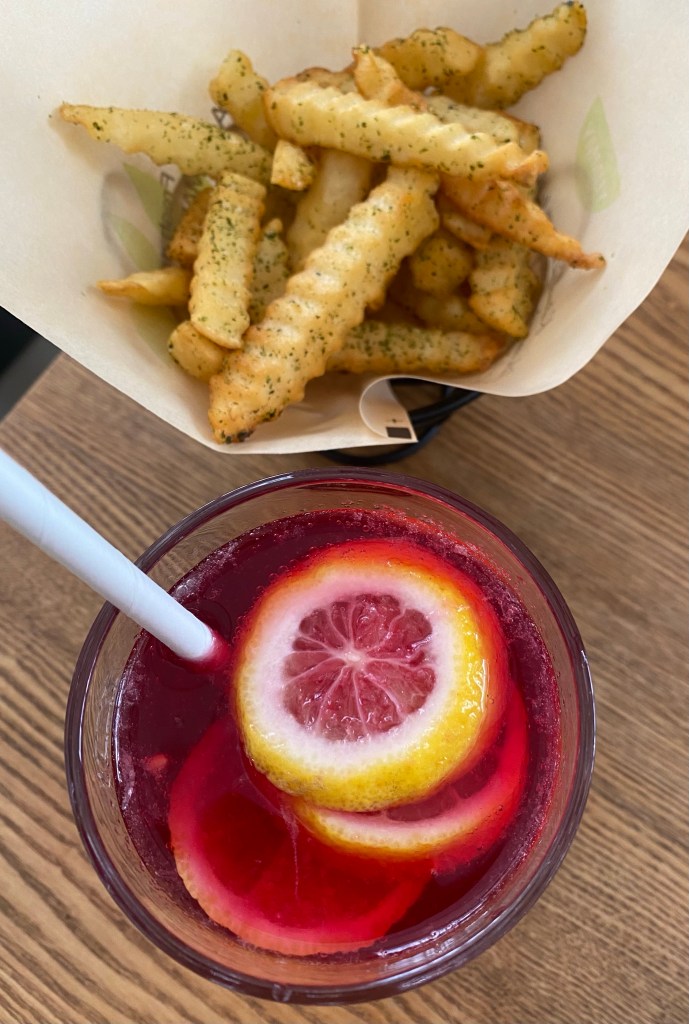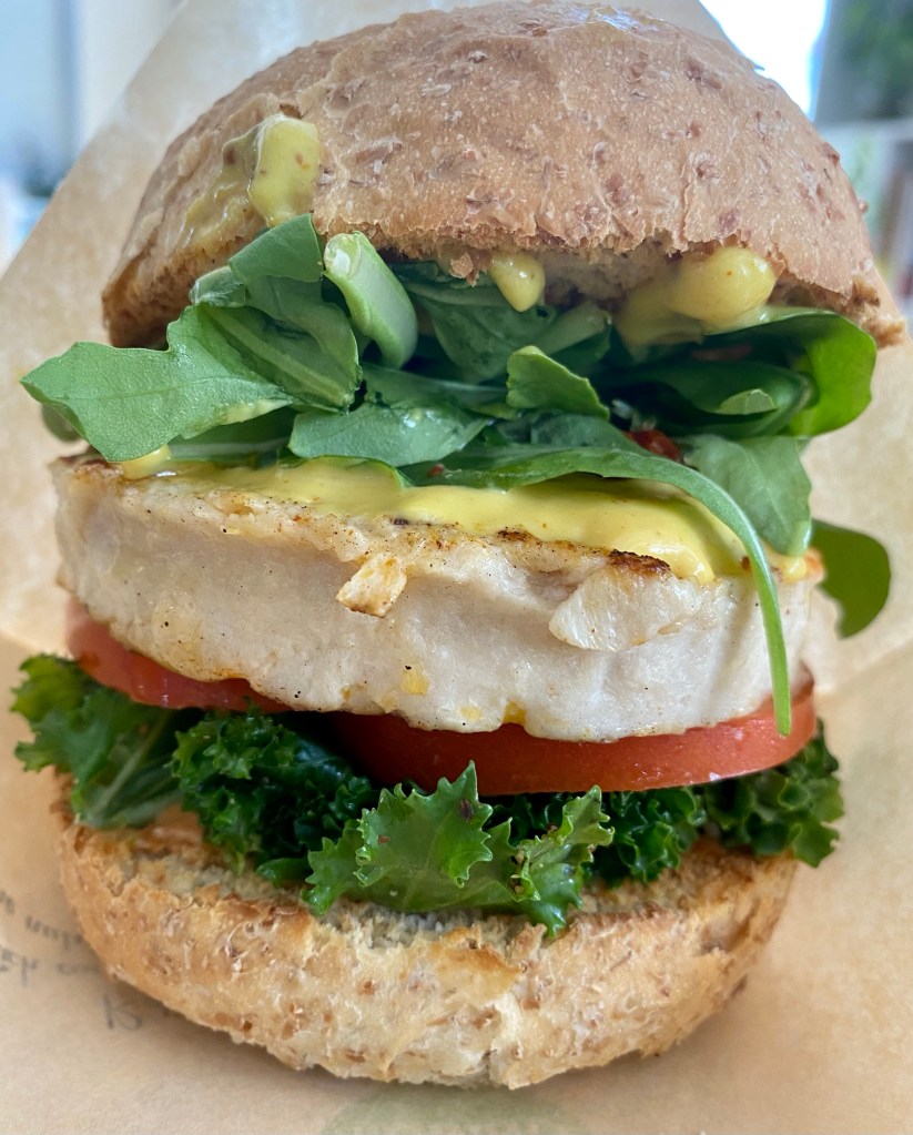 I ordered the sesame vegetable wrap and a ‘chick n cheesy’ power slider. Greg ordered the same burger but full size and seaweed fries. For drinks I went with beetroot and soda and Greg had the apple and kale. Our food arrived quickly and it was obviously freshly prepared. We could hear the blender making our drinks and the veggies being chopped. The drinks, wrap and fries came out first. The sandwich was a powerful punch of crispy vegetables with a kick of hot sauce. There was a good balance of cabbage, peppers and kale (I hate it when wraps are just stuffed with tasteless lettuce). The crinkle cut fries were not too greasy and the saltiness from the seaweed powder was delicious. My drink had earthy tones from the beetroot cut through with sweetness from sliced lemon, it wasn’t too heavy because of the soda. Greg didn’t like it as much, he preferred his apple and kale which once again was well balanced and not too sweet.