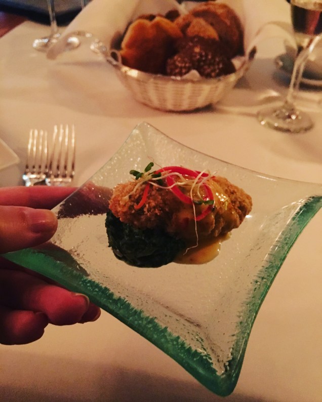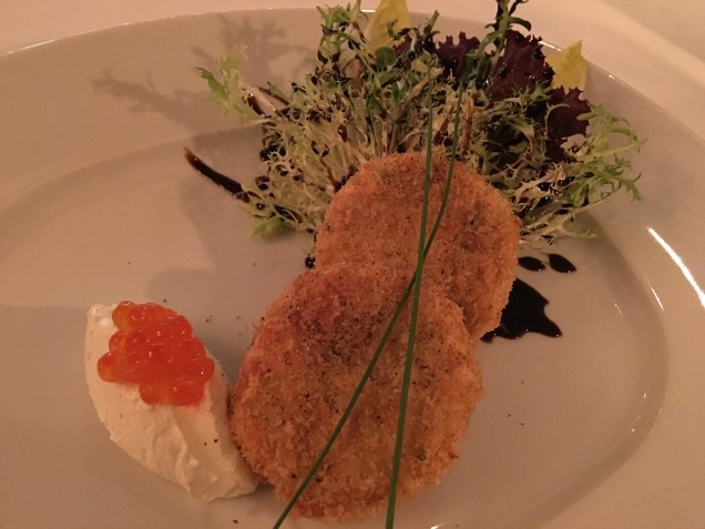 I opted for the lobster cocktail (I have recently discovered a love of seafood) and Greg chose crab cakes. Whilst waiting for our starters we were brought an amuse bouche. A deep fried oyster with a ‘volcano sauce’ which was absolutely delicious and the sauce got our taste buds singing!