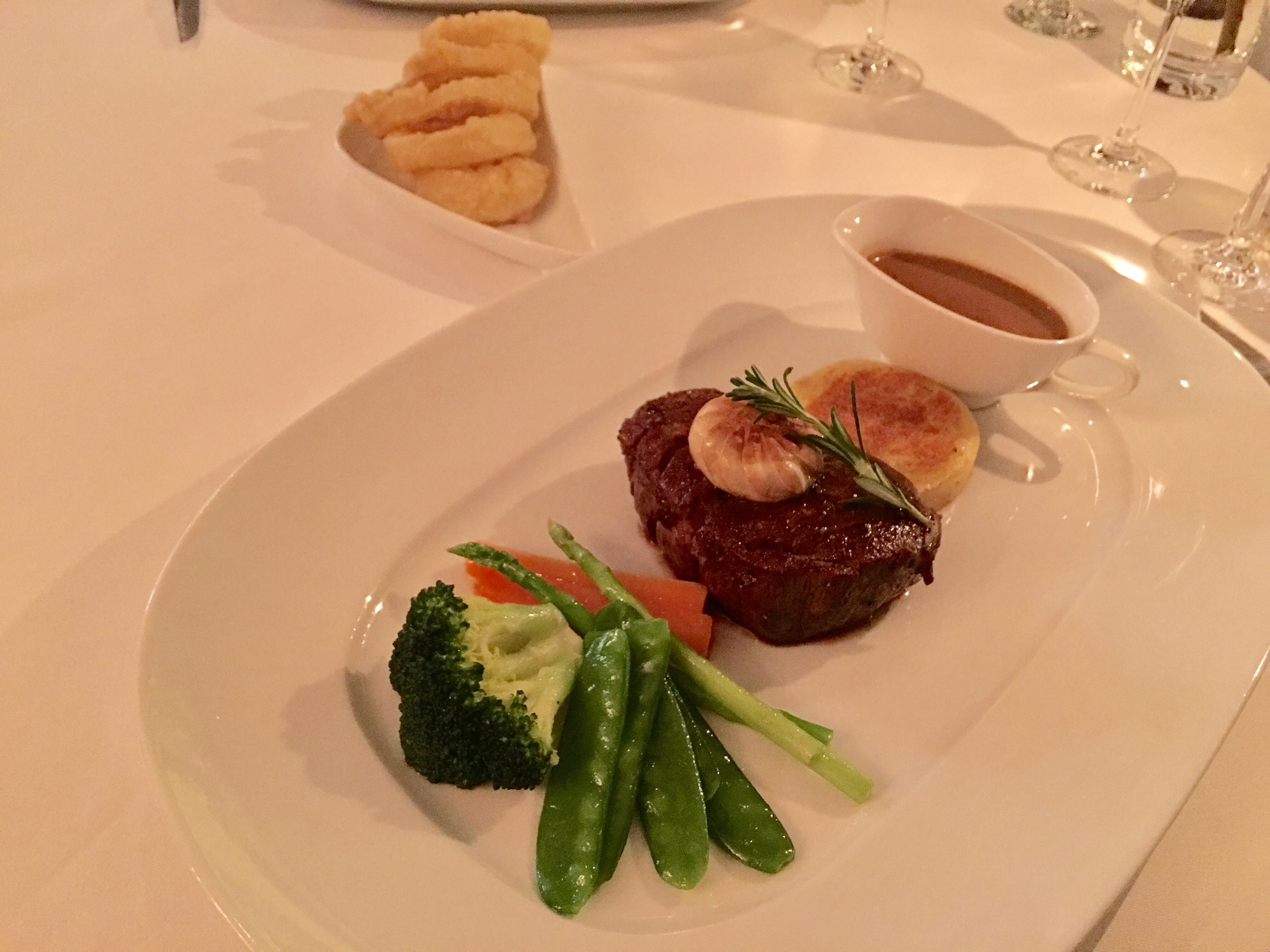 When the steaks arrived they were very well presented, cooked medium rare as requested and seasoned. The vegetables were lovely and crunchy and the hash brown was a perfect accompaniment along with the onion rings in a tempura style batter. We tried each other’s steaks and I felt the wagyu was a little sweeter and, as expected, had more marbelling than the USDA Prime but both were fantastic.