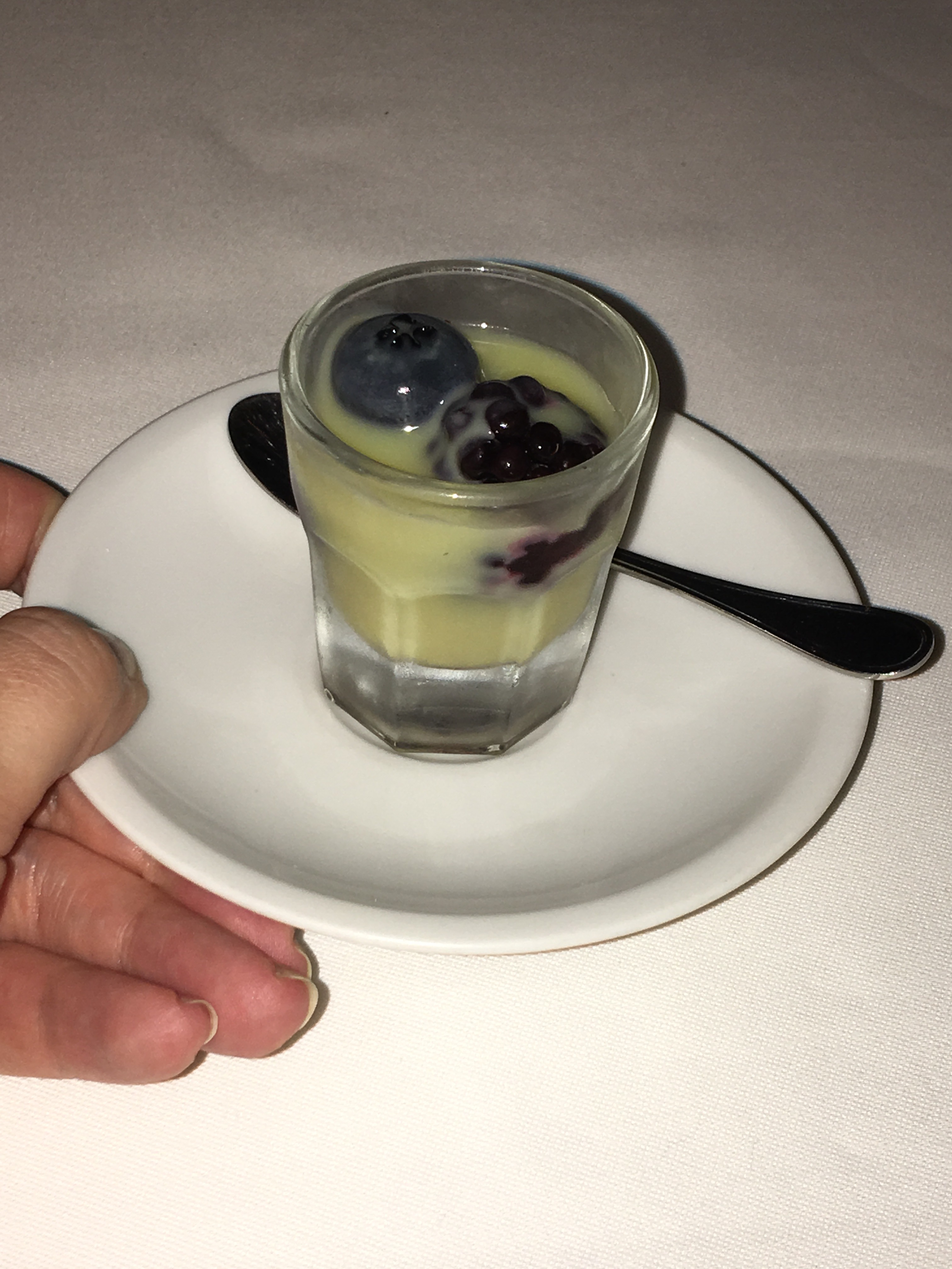 Firstly were brought a dessert teaser. A little shot glass filled with sweet berries and a white chocolate and whiskey sauce. I was a little reluctant to try this as I detest whiskey but Greg assured me it wasn’t too strong. He was right. It was a lovely sweet shot of tart berries and creamy chocolate which, even if you don’t like dessert, was a nice sweet way to end the meal.