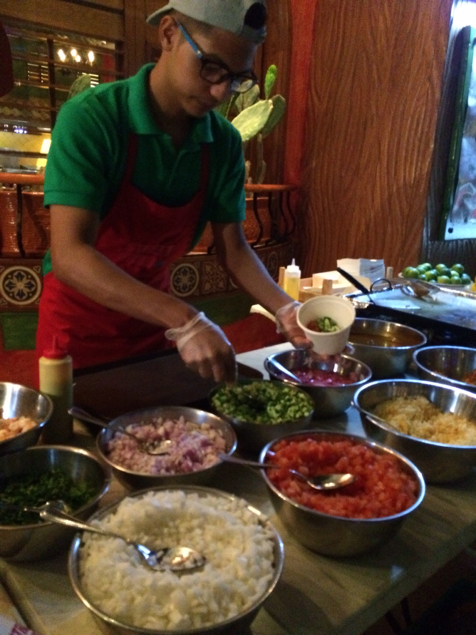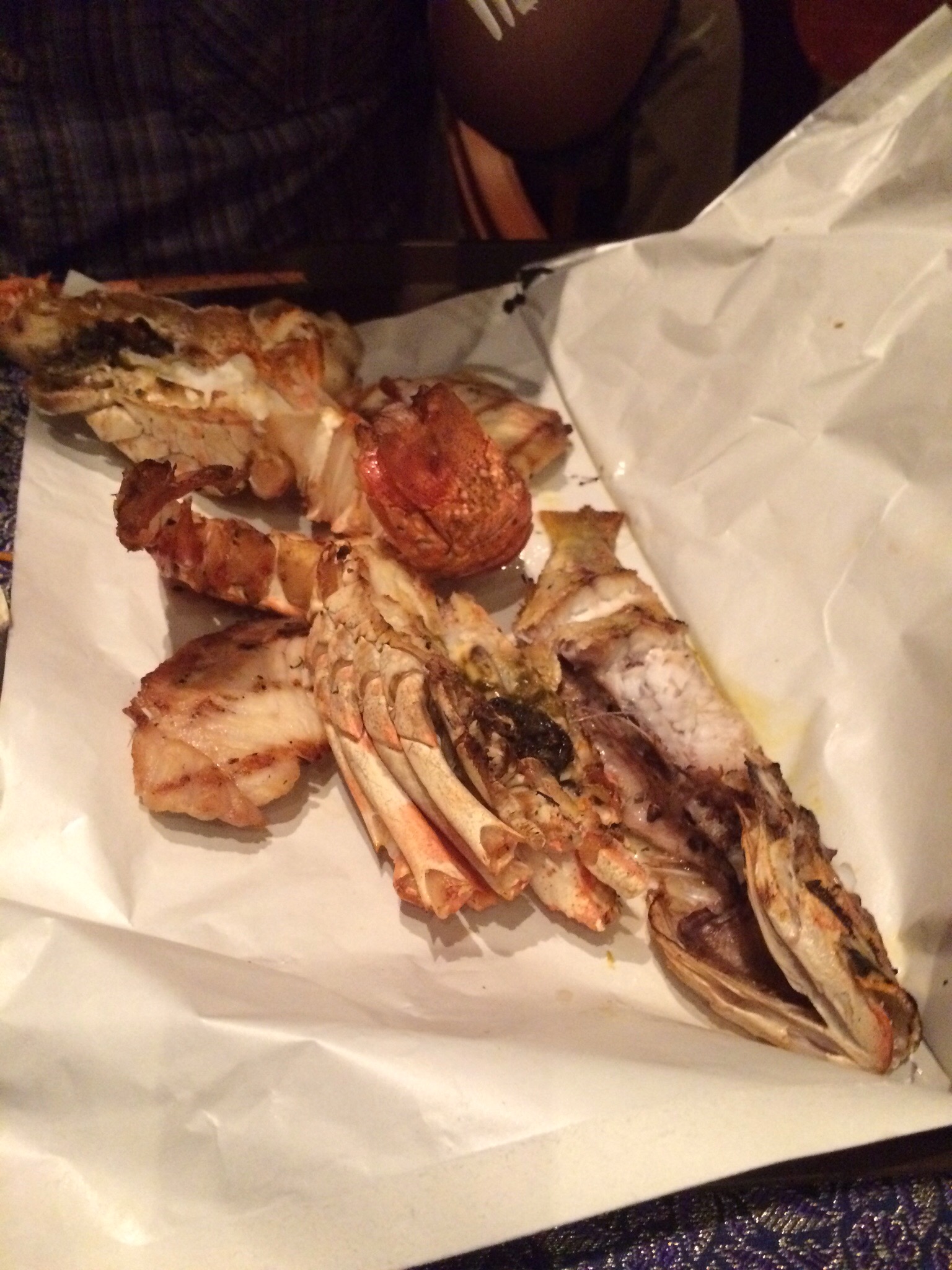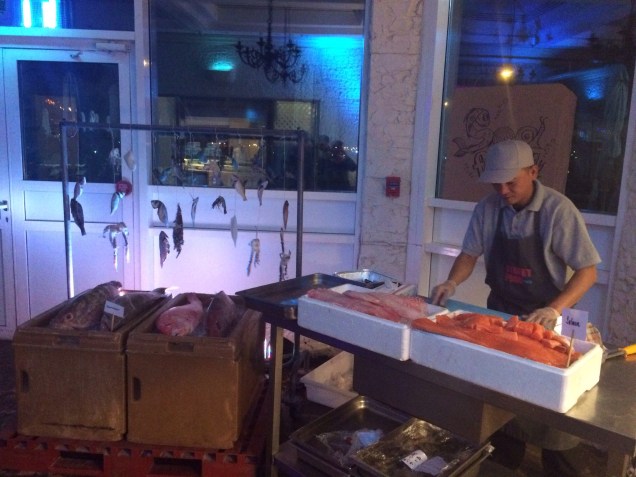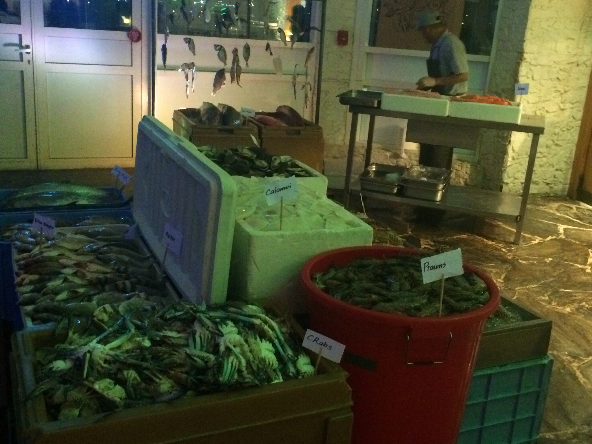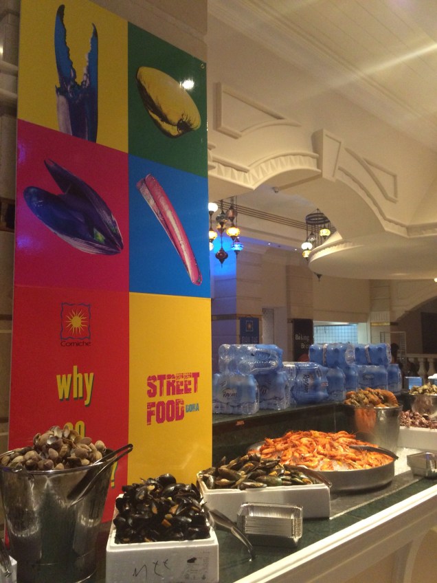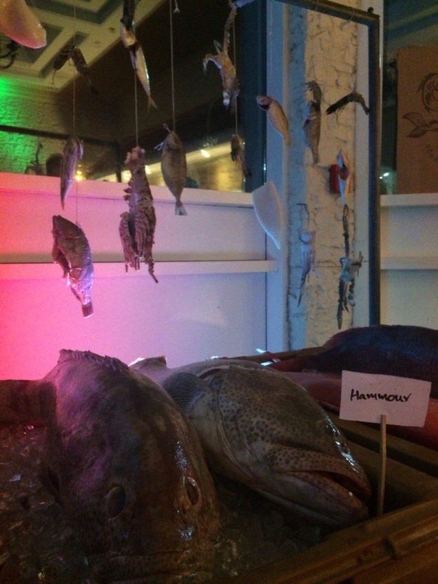 We were given a glass of delicious mango lassi then told we could go to any of the cooking stations to get food and any of the fridges to get drinks. We were taken back by just how big the ‘market’ was –  stalls from various nationalities with their wares beautifully displayed, music playing, food sizzling, cardboard signage, flags, people wandering and interacting with the ‘vendors’ it was lots of fun. It’s a good concept well executed, lots of effort gone into giving the impression of no effort. When we thought we’d come to the end of all the cooking stations we found a room which was designed like a fish market where you could select fresh fish (hammour, mussels, shrimp, crab, snapper, lobster) then hand it over to be cooked and then collected 30 minutes later. The staff here were really friendly and helpful.