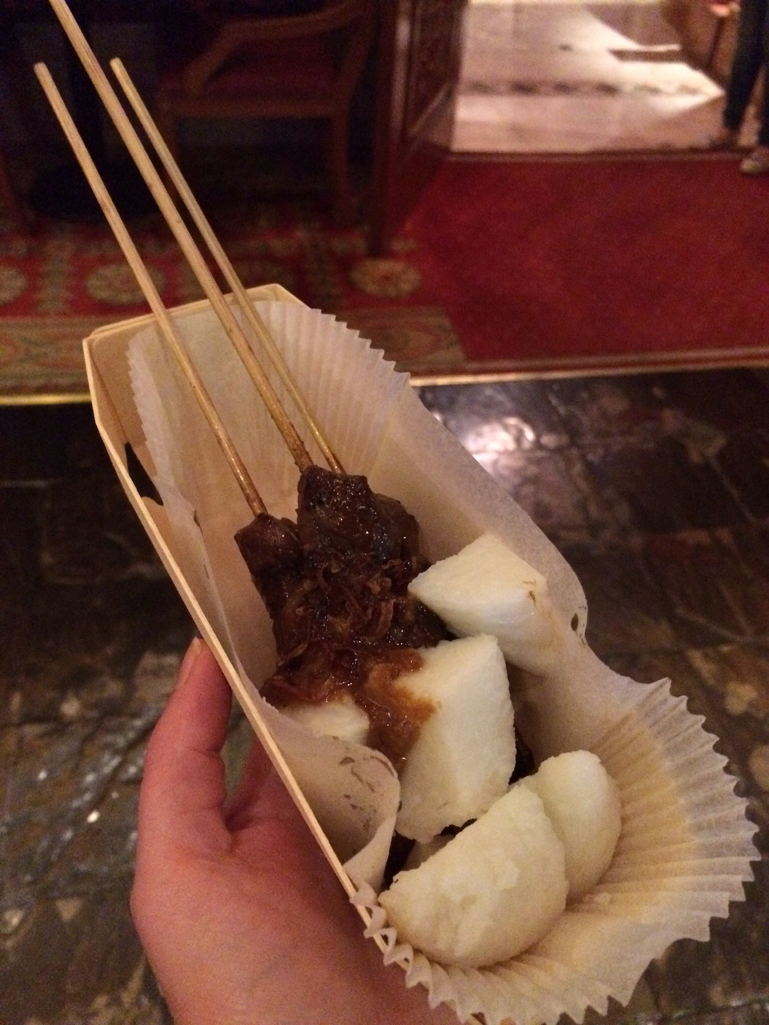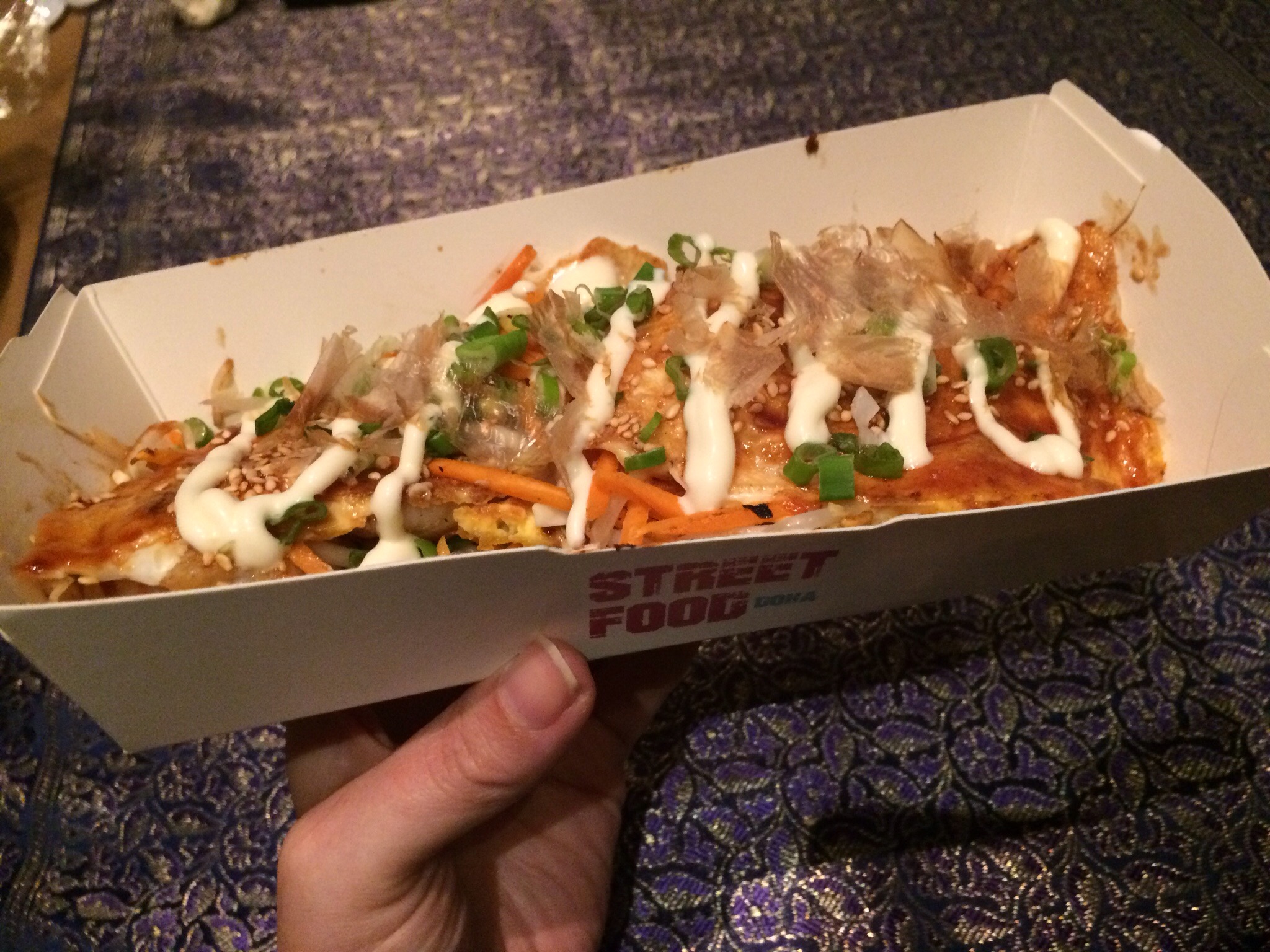 I started with British – beef stew in a tin, a mini shepherds pie in a foil tray and a wedge of pie. All delicious comfort food. Due to the Street Food theme everything is sold in paper or foil trays, plastic or paper cups, polystyrene cups or paper cones and you simply grab a tray and make your selections. Everything is cooked fresh to order so you can choose your own ingredients and personalise it to your taste. Greg loved the Japanese pancakes, samosas, tacos and spring rolls. I enjoyed sweet potato wedges, beef brisket, ceviche and satay skewers. The fish we had ordered was fantastic too especially the lobster.